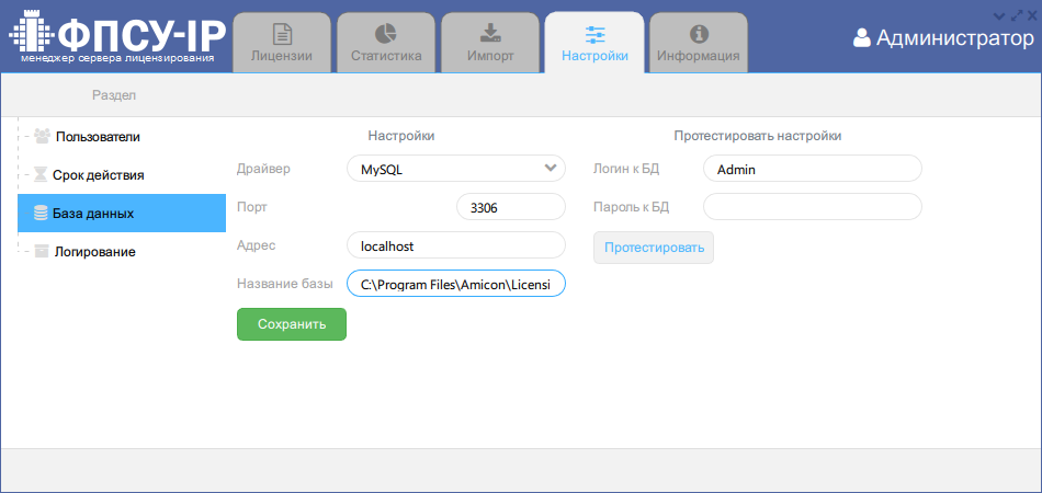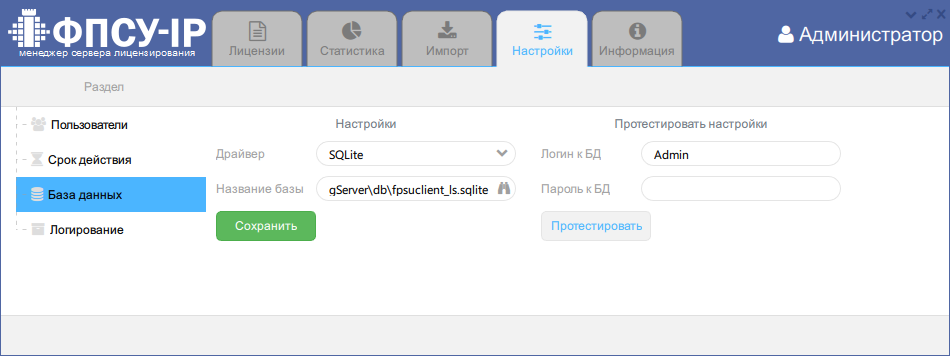 На вкладке «Настройки→База данных» находятся текущие настройки базы данных сервера лицензирования и настройки тестирования подключения к базе данных сервера лицензирования.