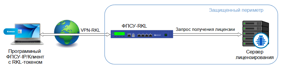 При подключении RKL-токена к рабочей станции с установленным ФПСУ-IP/Клиентом, ФПСУ-IP/Клиент устанавливает защищенное соединение с ФПСУ-RKL и запрос получения лицензии отправляется на Сервер лицензирования, в ответ на запрос ФПСУ-IP/Клиент получает лицензию. Параметры подключения RKL-токена к ФПСУ-RKL могут быть заданы заранее на ЦГКК администратором безопасности, а также могут быть изменены администратором RKL-токена. |