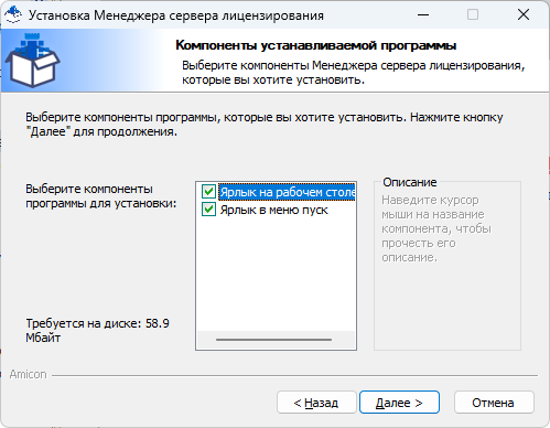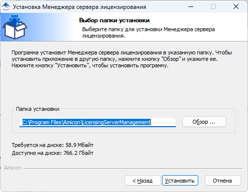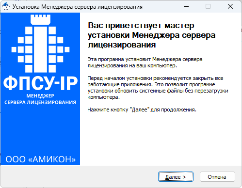 3. Рекомендуется закрыть все работающие приложения и нажать кнопку «Далее». Укажите каталог, в который будет установлен Менеджер сервера лицензирования, или оставьте по умолчанию «%\Program Files\AMICON\LicensingServerManagement».