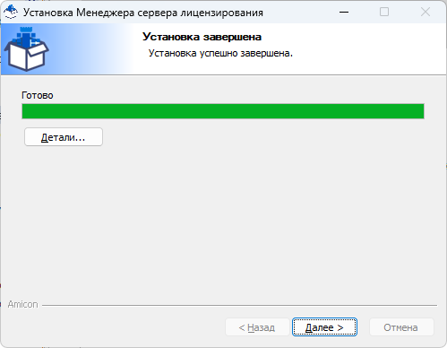 6. Требуется сменить пароль по умолчанию для пользователя «Администратор» в Менеджере сервера лицензирования при первом запуске (см. пункт «Смена пароля»). Для запуска Менеджера сервера лицензирования выберите в списке программ команду «Пуск→Amicon→LicensingServerManagement». Установка Менеджера сервера лицензирования завершена. |