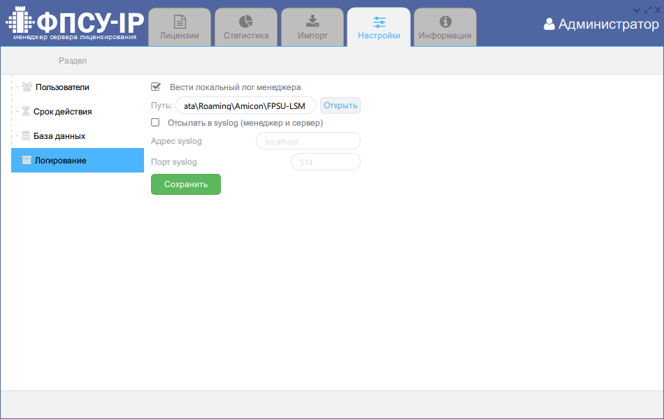 Процесс логирования позволяет вести системный журнал событий сервера, действий пользователей, которые приводят к изменению состояния базы данных сервера лицензирования. Настраивается на вкладке «Настройки→Логирование» установлением флага «Вести локальный лог менеджера». При установленном флаге необходимо задать путь к файлу лога или оставить по умолчанию (В ОС Windows - «%\AppData\Roaming\Amicon\FPSU-LSM», в ОС Linux - «%/var/log/amicon/fpsu-lsm»). Для сохранения настроек логирования нажмите кнопку «Сохранить». Файл лога записывается в формате .csv с текущей датой. Кнопка «Открыть» открывает каталог с файлами логов.