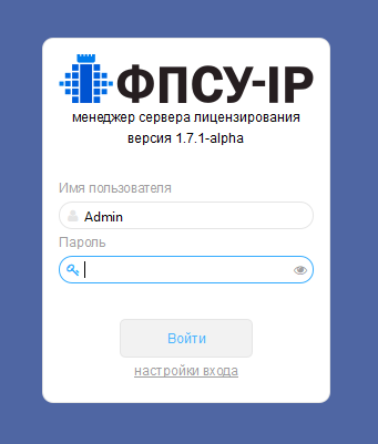 После установки программного обеспечения «Сервер лицензирования комплексов «ФПСУ-IP/Клиент», при первом запуске Менеджера сервера лицензирования необходимо сменить пароль администратора по умолчанию (см. пункт «Смена пароля»). При запуске менеджера требуется авторизация. Для прохождения авторизации введите имя пользователя и пароль предопределенной учетной записи администратора. При первом запуске «Admin/Amicon».
