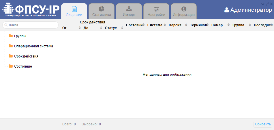 Информация на вкладках: «Лицензии» – управление списком лицензий, выдача, освобождение лицензии (см. пункт «Лицензии»); «Статистика» – в таблице выводится статистика по группам с подведением общих итогов (см. пункт «Статистика»); «Импорт» – загрузка лицензий в базу (см. пункт «Загрузка лицензий в базу данных сервера лицензирования»); «Настройки» – управление пользователями, настройки маркировки лицензий по сроку действия, настройки логирования, отправка сообщений syslog (см. пункт «Настройки»); «Информация» – информация о версии ПО и Разработчике (см. пункт «О версии программы»). |