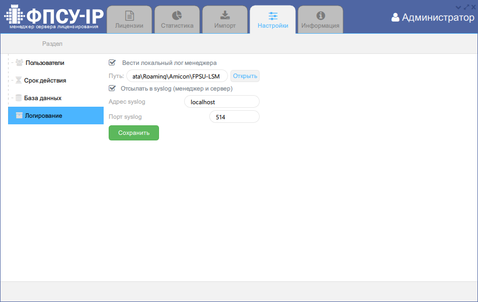 Сервер лицензирования поддерживает возможность отправки сообщений о происходящих событиях по протоколу syslog.