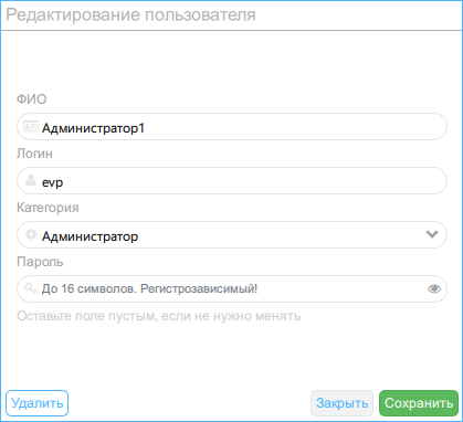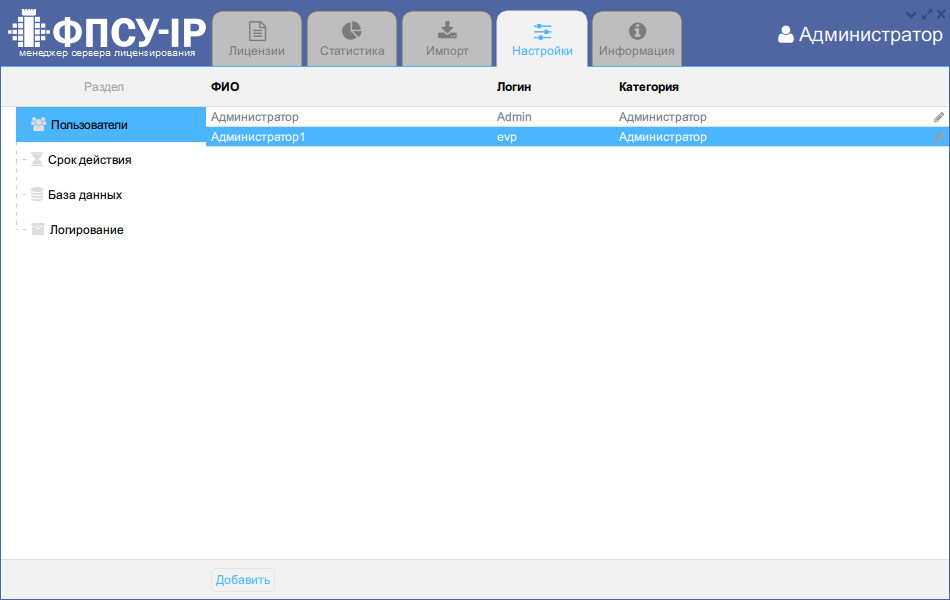 Учетная запись с логином «Admin» не может быть удалена, может быть переименована, изменено ФИО. Для удаления учетной записи перейдите на вкладку «Настройки→Пользователи», выделите учетную запись в списке и нажмите на карандаш.