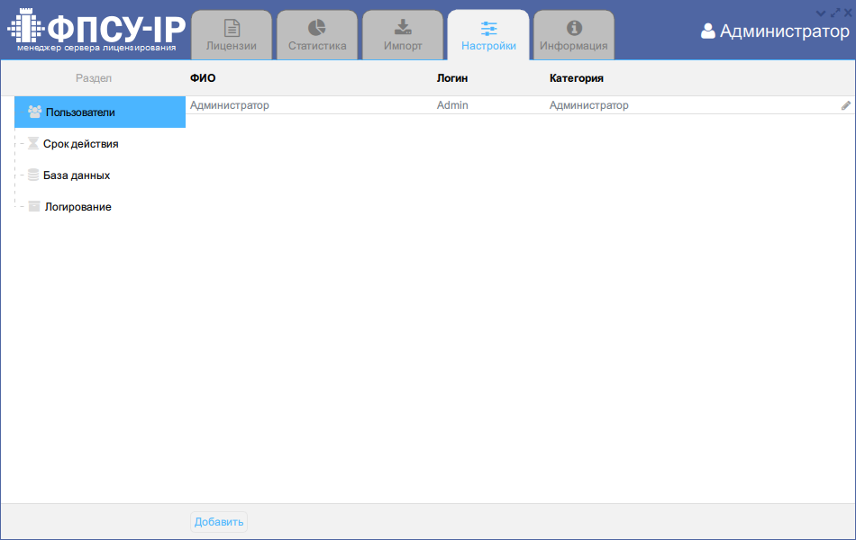 В списке учетных записей предопределена запись с логином «Admin». При первом запуске менеджера необходимо сменить пароль по умолчанию для этой учетной записи (см. пункт «Смена пароля»). Для каждой учетной записи определены права доступа, разрешенные действия в соответствии с ролью (см. пункт «Общие сведения», таблица 1). Учетная запись с ролью администратора имеет доступ на управление списком пользователей, позволяет добавлять и удалять любые учетные записи, изменять пароль любой учетной записи. Для добавления учетной записи нажмите кнопку «Добавить» в нижней части окна.