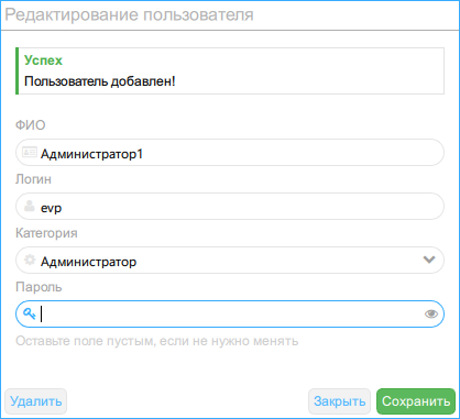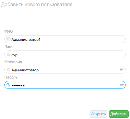 Введите наименование учетной записи - ФИО, логин, выберите роль (категорию) в соответствии с разрешенными действиями для данной учетной записи, задайте пароль. Нажмите кнопку «Добавить».