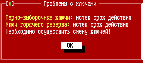 В случае получения оповещения необходимо сменить ключи (см. пункты «Переинициализация ключа ПДСЧ» и «Замена ключа горячего резерва» ).