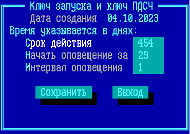 При выборе пункта меню «Ключ запуска и ключ ПДСЧ» или «Ключ горячего резерва» открывается окно настроек сроков действия выбранных ключей, в котором указывается дата создания ключа и текущие настройки.