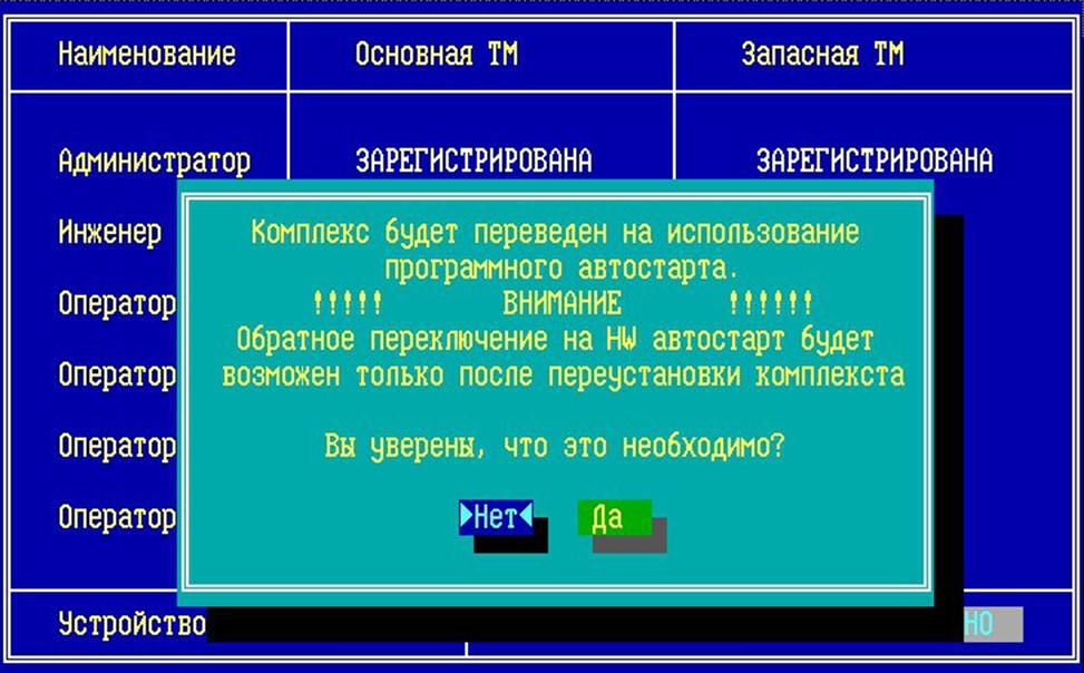 Внимание! Если после инициализации устройства HW администратор активирует программную подсистему автозапуска, данное действие будет необратимым. Для возврата к разрешению запуска ФПСУ с помощью устройства HW потребуется переустановка программного обеспечения ФПСУ и последующая инициализация устройства автозапуска HW. При активации программной подсистемы автозапуска на ФПСУ с инициализированным устройством автозапуска HW на экран будет выдано предупреждение: