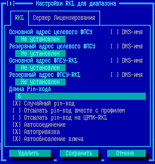 В зависимости от используемой схемы обновления ключевых данных на ФПСУ-IP/Клиентах (см. пункт «RKL для обновления ключевых данных клиентов») установите на целевом ФПСУ и на ФПСУ-RKL настройки RKL для клиентов VPN-Key и клиентов RKL-токенов. В окне «Настройки RKL для диапазона» на вкладке «RKL» доступны следующие параметры:
