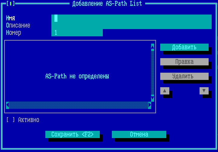 Для выхода в меню с сохранением настроек протокола BGP, нажмите кнопку «Сохранить» или клавишу <F2>. Для выхода без сохранения настроек нажмите клавишу <Esc>.