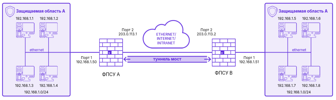 Предположим, что IP-сеть организации до установки ФПСУ представляла одну подсеть с IP-адресом 192.168.1.0 и маской 255.255.255.0 (24 разряда), требуется передавать пакеты внутри локальной сети, разделенной географически. Для того, чтобы организовать такую «прозрачную» защищенную передачу данных, достаточно на внешних портах ФПСУ А и ФПСУ В создать описатель партнера по шифрованию и включить режим моста для туннеля ФПСУ А ↔ ФПСУ В. При этом на внутренних портах ФПСУ А и ФПСУ В не должно быть описано абонентов (хостов, подсетей, записи «любой хост») - пакеты от явно указанных на портах ФПСУ абонентов не передаются в туннель типа «мост» (подробнее см. пункт «Режим «Мост» между ФПСУ (L2-шифрование))»):