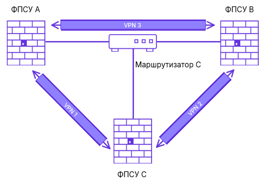 В данном варианте конфигурации на каждом ФПСУ будет создаваться по два VPN-туннеля. Всего будет создано три VPN-туннеля. При этом для обмена данными защищаемые области будут использовать следующие туннели: •VPN-1 - обмен области А с областью С; •VPN-2 - обмен области В с областью С; •VPN-3 - обмен области А с областью В. На рисунке ниже показаны организованные VPN-туннели.