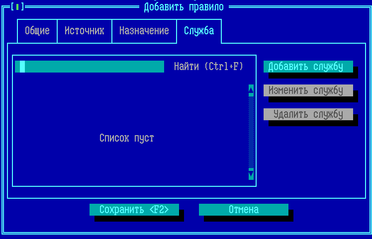 Введите в поле ввода искомую службу или первые символы, по которым будет вестись поиск в списке служб, и нажмите сочетание клавиш <Ctrl+F>. При посимвольном поиске сочетание клавиш нажимается несколько раз. После подтверждения выбора службы клавишей <Enter>, в списке применяемых к правилу служб появится запись о добавленной службе: