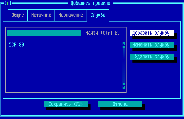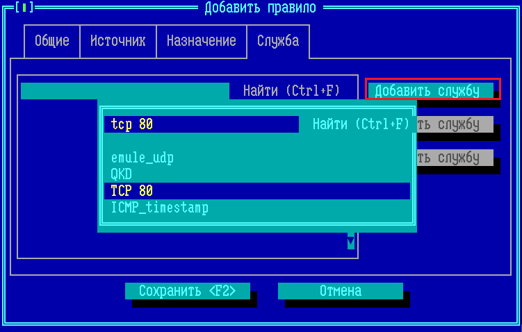 Для внесения новой службы в список, нажмите кнопку «Добавить службу» и выберите из появившегося перечня заранее созданных служб (на примере в конфигурации ФПСУ заранее создана служба с именем «TCP 80»):