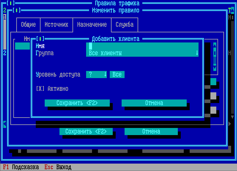 Сеть — для добавления в список обрабатываемых правилом источников подсети IP-адресов, следует установить курсор на строке «Сеть», затем по нажатию клавиши <Tab> перейти на кнопку «Добавить» и нажать <Enter>. Подсеть должна быть выбрана из диапазона подсетей, прописанных в маршрутизации на портах ФПСУ, либо входить в такую. Клиент — для добавления в список обрабатываемых правилом источников трафика данных, поступающих от ФПСУ-IP/Клиентов, следует установить курсор на строке «Клиент», затем по нажатию клавиши <Tab> перейти на кнопку «Добавить» и нажать <Enter>. Описатель клиента должен быть выбран из заранее сконфигурированной на ФПСУ группы клиентов зарегистрированной Криптосети или соответствовать значению "Все клиенты PKI". Для группы клиентов PKI может быть задано условное правило, применяемое в зависимости от текущего уровня доступа клиента. Уровень доступа клиент получает по протоколу RADIUS от сервера авторизации (см. пункты RADIUS и Настройка диапазона клиентов на работу с Radius). В правиле трафика в Источнике или Назначении выбирается тип Клиент и задается условие для сравнения уровня доступа (>, <, ==, != <=, >=) и уровень доступа для группы клиентов. Правило срабатывает, если выполняется заданное условие для уровня конкретного клиента.
