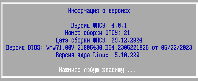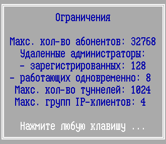 Меню «Справка» содержит следующие команды: •«Клавиши управления» - вывод на экран справки о функциональных клавишах и их назначении (см. пункт «Запуск ФПСУ в режим фильтрации пакетов»); •«Информация о версиях» - вывод на экран справки о версии и номере и дате сборке ПО ФПСУ, модели материнской платы, аппаратной платформе, архитектуре ЦПУ; •«Информация об установленных подсистемах» - вывод на экран информации об установленных подсистемах (горячий резерв, поддержка IP-клиентов и др.), серийном номере ФПСУ, а также количестве лицензированных ядер процессора ФПСУ; •«Информация об аддонах» - вывод на экран справки об установленных дополнениях и их состоянии (dhcp, http-proxy, ids и т.д.); •«Информация о системе» - вывод на экран справки о системе аппаратной платформы; •«Ограничения» - вывод на экран справки о верхних границах ряда параметров (подробная таблица приводится в пункте «Ограничения функционала ФПСУ в зависимости от оперативной памяти»); •«Информация о продукте» - вывод на экран информации данные о Разработчике.
