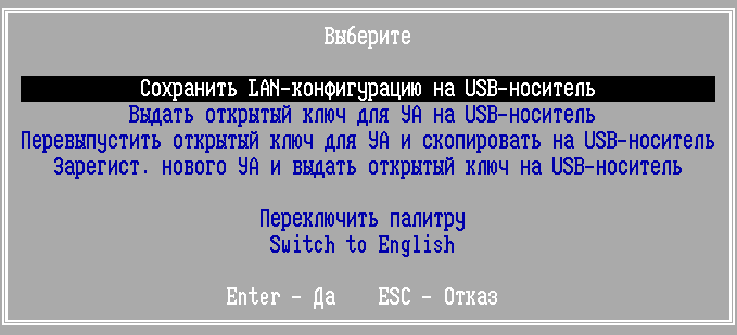 При выполнении операции необходимо подтверждение полномочий посредством подключения TM-идентификатора, кроме того, вход может быть защищен паролем подключаемого ТМ, в этом случае будет запрашиваться пароль подключенного ТМ-идентификатора для авторизации в системе. Меню УА содержит следующие команды: «Сохранить LAN-конфигурацию на USB-носитель» – команда записи текущей конфигурации ФПСУ в специальном формате на съемный носитель без остановки рабочего режима ФПСУ, без перехода в режим конфигурирования. Операция доступна администраторам класса Инженер и выше (см. пункт «Разграничение доступа и пользователи»). Подключите USB-носитель и выполните команду, будет выдано сообщение об успешном выполнении команды. На внешнем носителе создается каталог с серийным номером ФПСУ с файлом конфигурации с расширением .cfb в разжатом виде. Файл конфигурации с расширением .cfb может быть загружен удаленным администратором в программу «Удаленный администратор ФПСУ» для просмотра, изменения и дальнейшей установки на ФПСУ. «Выдать открытый ключ для УА на USB-носитель» – команда записи текущего открытого ключа ФПСУ на внешний носитель, с целью регистрации его удаленным администратором. Операция доступна администраторам класса Администратор и выше. Выполняется без остановки рабочего режима ФПСУ, без перехода в режим конфигурирования. Подключите USB-носитель и выполните команду, будет выдано сообщение об успешном выполнении команды. На внешнем носителе создается каталог с серийным номером ФПСУ с файлом с расширением .CO1 - признак основного ФПСУ, .CO2 - горячего резерва. Команда доступна также в режиме изменения параметров конфигурации и настройки системы, более подробно см. пункт «Ключи ФПСУ для связи с УА». «Перевыпустить открытый ключ для УА и скопировать на USB-носитель» – команда выработки нового открытого ключа ФПСУ и его записи на внешний носитель, с целью регистрации его удаленным администратором. Выполняется без остановки рабочего режима ФПСУ, без перехода в режим конфигурирования. Операция доступна администраторам класса Администратор и выше. На внешнем носителе создается каталог с серийным номером ФПСУ с файлом с расширением .CO1 - признак основного ФПСУ, .CO2 - горячего резерва. Данная команда доступна также в режиме изменения параметров конфигурации и настройки системы, более подробно см. пункт «Ключи ФПСУ для связи с УА», команда «Создать новые ключи». «Зарегистрировать нового УА и выдать открытый ключ на USB-носитель» – команда регистрирует на ФПСУ учетную запись удаленного администратора ФПСУ и записывает текущий открытый ключ ФПСУ на внешний носитель для дальнейшей регистрации данного ФПСУ в программе «Удаленный администратор ФПСУ». Операция доступна администраторам класса Администратор и выше. На USB-носителе может быть не более одного описателя удаленного администратора, иначе новый удаленный администратор не будет зарегистрирован. Выполняется без остановки рабочего режима ФПСУ, без перехода в режим конфигурирования. При выполнении команды система выполняет поиск на подключенном внешнем USB-носителе открытого ключа удаленного администратора. Если открытый ключ удаленного администратора найден, он будет зарегистрирован на ФПСУ как разрешенный к работе с правами «Опрос текущего состояния» и «Получение данных о работе А