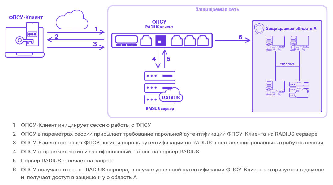 ФПСУ становится транспортом пароля между ФПСУ-IP/Клиентом и внешним сервером RADIUS. ФПСУ передает пароль по протоколу RADIUS на сервер и возвращает ответ с разрешением или запретом, в случае разрешения пользователь авторизуется в защищенной сети.