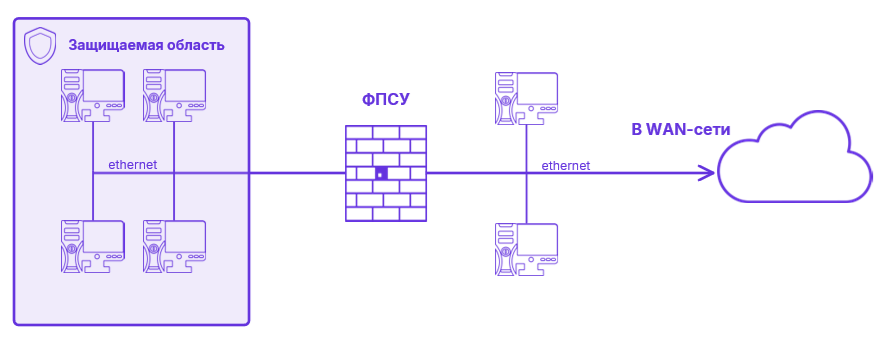 Таким образом, из локальной сети выделяется группа абонентов (защищаемая область), для которых обмен IP-пакетами с остальными абонентами сети может быть специальным образом регламентирован и проконтролирован. Применяя ФПСУ по этой схеме, можно разделить локальную сеть на две части (не меняя при этом IP-адресов и установок сетевого программного обеспечения хостов), одна из которых защищена, а абонентам другой будет разрешён обычный обмен пакетами. По этой же схеме можно установить ФПСУ на выходе из локальной сети в удаленные сети и защитить работу всей локальной сети. Если обмен пакетами абонентов будет производиться через один ФПСУ, может быть реализован только самый слабый уровень защиты, так называемый режим ретрансляции, при котором будут задействованы только механизмы фильтрации пакетов по различным критериям. Более высокий уровень защиты возможен при обмене пакетами через два аналогичных ФПСУ, работающих в паре. В этом режиме включаются механизмы аутентификации абонентов защищённых сегментов ЛВС и трансляции их сетевых адресов, скрывающей внутренние адреса субъектов и объектов передачи, а также используемых ими сетевых протоколов и прикладных функций защищаемой сети. Кроме того, в таком режиме могут быть использованы механизмы сжатия и шифрования.