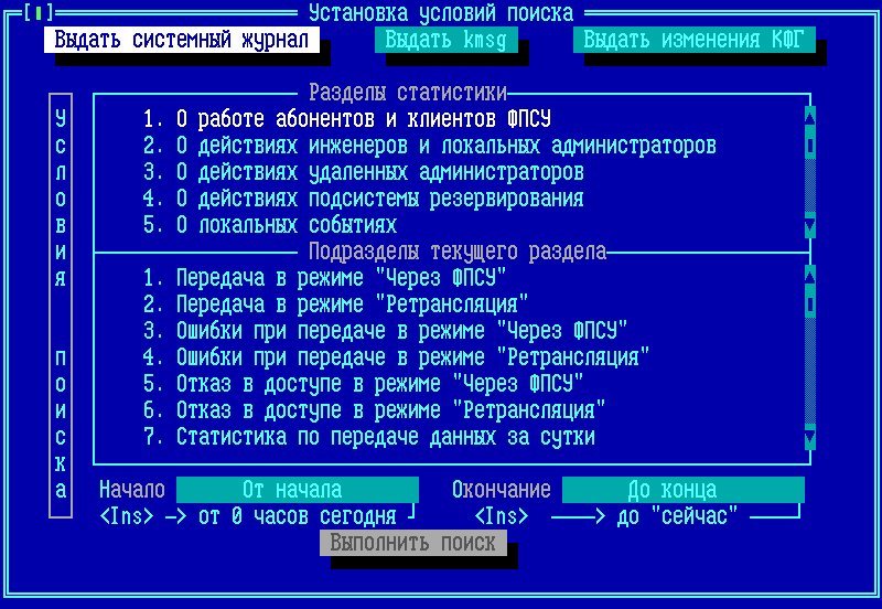Для получения необходимых данных сначала отметьте нужный раздел, для чего выделите соответствующую строку и нажмите <Пробел>. При этом строка будет выделена слева знаком «√», а в окне подразделов отобразится относящийся к данному разделу список. Переход к подразделам осуществляется по нажатию <Tab> или <→>. Подразделы отмечаются так же, как и разделы. Возврат от подразделов к разделу осуществляется по нажатию клавиши <←>. Далее укажите интервал времени, за который будет выбираться статистика. При входе в окно поля ввода времени будут содержать строки «От начала» и «До конца». Если необходимо задать другой интервал времени, можно вручную ввести необходимые значения в формате ДД.ММ.ГГГГ, где ДД - число, ММ - номер месяца, ГГГГ - год, и нажать <Enter>. Если формат введенных данных верен, установится новое значение, если нет - сохранится старая запись. Переход между всеми полями осуществляется по нажатию <Tab>. После задания всех требуемых установок для поиска следует при помощи клавиши <Tab> отметить команду «Выполнить поиск» и нажать клавишу <Enter>. Подсистема регистрации осуществит поиск и выдаст результат на экран:
