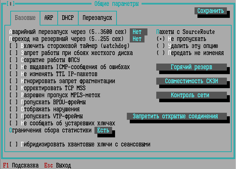 Включение или выключение опций осуществляется клавишей <Пробел>. Настройки на вкладке «Базовые» окна «Общие параметры»: Аварийный перезапуск. Если при работе ФПСУ происходит аппаратный сбой сетевых адаптеров, ФПСУ способен детектировать это событие и выдать на экран монитора специальное сообщение, сопровождающееся звуковым сигналом, после чего через некоторое время ПО сетевых адаптеров и ПО ФПСУ автоматически перегрузятся, после чего ФПСУ попытается восстановить работу режима фильтрации пакетов. В диалоговом поле строки укажите время, в течение которого будет выдаваться сообщение перед перезагрузкой (в диапазоне от 5 секунд до 1 часа). Если автоматический перезапуск не нужен (например, необходимо ознакомиться с диагностикой неполадок, выданной на экран монитора), оставьте поле пустым; в таком случае при возникновении аппаратного сбоя сообщение, сопровождаемое звуковым сигналом, будет выдаваться до его отмены администратором при локальном управлении. Переход на резервный. Если при работе ФПСУ получает сигнал от сетевой аппаратуры об отсутствии физического соединения на каком-либо из рабочих портов, ФПСУ может передать управление партнеру по системе горячего резервирования. В диалоговом поле строки укажите время, по истечении которого будет задействован резервный ФПСУ (в диапазоне от 5 до 255 секунд), или оставьте поле пустым, если такая операция не требуется. Включить сторожевой таймер (watchdog). Этот флаг позволяет активировать автоматическую перезагрузку ФПСУ при аппаратном или программном «зависании» комплекса. При включении таймера активируется аппаратный таймер, если материнская плата им оборудована, и его программный аналог, который реализован в операционной системе и не зависит от материнской платы. В случае задействования обоих датчиков, порядок их срабатывания следующий: через 30 секунд после зависания ФПСУ должен сработать программный датчик, перегрузив ФПСУ, если программный датчик не сработал в течение 5 минут, сработает аппаратный watchdog. Запрет работы при сбоях жесткого диска. Если во время работы подсистемы фильтрации возникают сбои или неполадки внутреннего носителя информации, ФПСУ продолжает функционировать до принудительного выхода из подсистемы фильтрации без записи регистрационных данных в хранилище статистической информации. Если политика безопасности исключает подобный аварийный режим без записи статистики, и ФПСУ при сбоях внутреннего накопителя информации должен прекращать свою работу – задействуйте этот флаг. ВНИМАНИЕ! При работе ФПСУ в режиме резервирования возможны ситуации, при которых запрет будет игнорироваться. При сбоях ПЗУ на активном ФПСУ, управление передается резервному, который будет продолжать работу даже в случае возникновения собственных аппаратных неполадок. Сокрытие работы ФПСУ. В зависимости от требуемой степени защиты администратор может включить флаг конфигурации, указывающий ФПСУ, что он должен работать в режиме сокрытия своих защитных (фильтрующих) функций. При включенном флаге ICMP-сообщения о недоступности абонента по причине административного запрета для пакета, не прошедшего фильтрацию, генерироваться не будут, а если ошибка произошла по другой причине, в посылаемом ICMP-сообщении в качестве адреса отправителя сообщения будет проставлен не адрес Ф