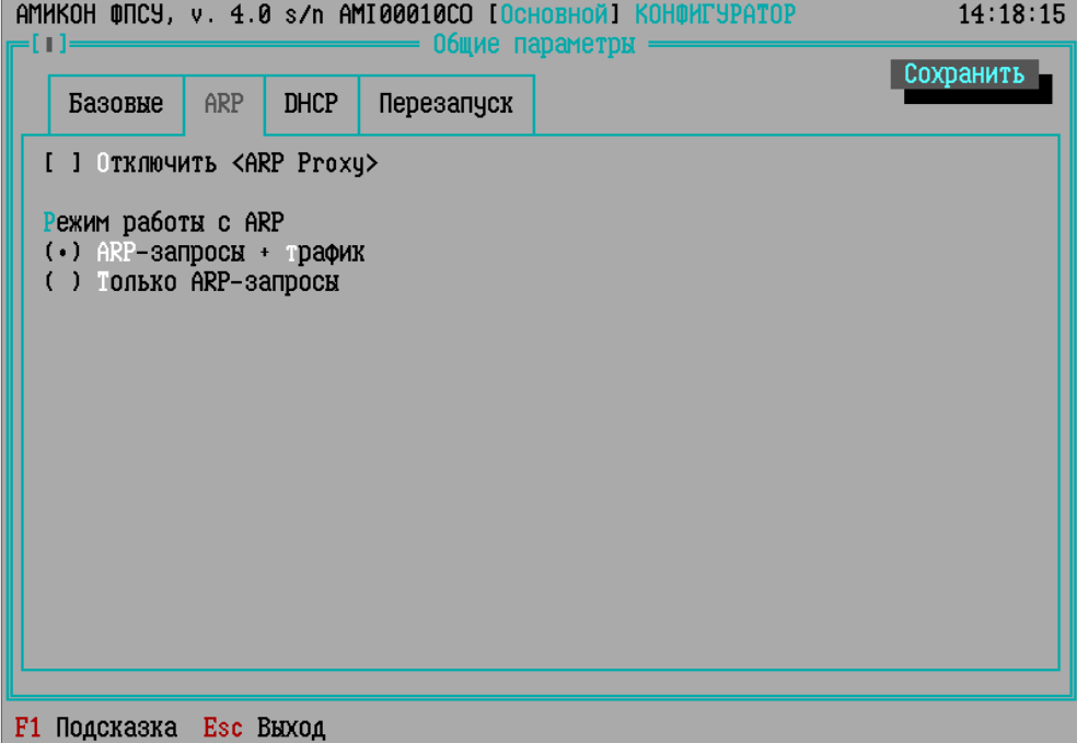 Отключить <ARP-proxy>. Для обеспечения «прозрачности» функционирования, в ФПСУ реализован стандартный механизм ARP-proxy со специфичной ARP-фильтрацией, гарантирующей получение ARP-ответа станции, запрашивающей проход через ФПСУ к удаленному ресурсу. Если необходимость в такой функции отсутствует (например, в случае, когда по обе стороны ФПСУ установлены маршрутизаторы) или требуется снизить нагрузку на сеть, ARP-proxy можно отключить, установив описываемый флаг. В этом случае ФПСУ будет отвечать только на те ARP-запросы, которые касаются его собственных IP-адресов или адресов клиентов, находящихся в состоянии соединения. ВНИМАНИЕ! При отключении ARP-proxy для обеспечения работоспособности сети необходимо в конфигурации смежного сетевого оборудования описать конфигурируемый ФПСУ в качестве одного из маршрутизаторов. Режим работы с ARP – опция, позволяющая выбирать режим формирования ARP-таблицы на ФПСУ. Возможны два варианта настройки: •ARP-запросы + трафик – опция по умолчанию, ARP-таблица формируется из ответов на собственные ARP-запросы, а также из входящих пакетов, передаваемых через ФПСУ; •Только ARP-запросы – при выборе этой опции, ARP-таблица формируется только из ответов на собственные ARP-запросы. Рекомендуется при использовании ФПСУ вместе со сторонними решениями оптимизации передаваемого трафика (таких как Riverbed SteelHead).
