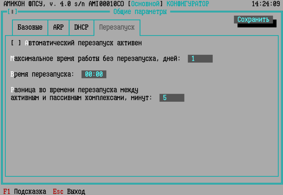 Использовать адрес после истечения аренды – ФПСУ может выступать в роли DHCP-клиента, в этом случае ФПСУ может запрашивать у DHCP-сервера IP-адреса для своих портов. IP-адрес для порта ФПСУ арендуется на определенное время, установленное на DHCP-сервере. По истечении срока аренды ФПСУ должен либо продлить аренду, либо перестать использовать IP-адрес. После истечения срока аренды сетевая активность на порту прекращается (ФПСУ отправляет сообщение DHCPDISCOVER), чтобы предотвратить обрыв соединений в случае недоступности DHCP-сервера, можно установить время в минутах, в течении которого порт будет доступен по старому IP-адресу (ФПСУ продолжает отсылать сообщение DHCPREQUEST в течении этого времени для продления аренды). После истечения и этого времени ФПСУ перестанет использовать IP-адрес. Настраивая данную опцию, администратор должен быть уверен, что понимает последствия данного решения. Настройки на вкладке «Перезапуск» окна «Общие параметры»: