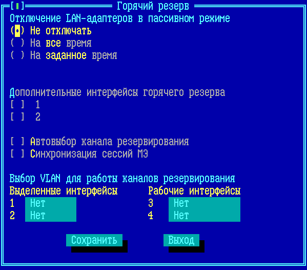 •Отключение LAN-адаптеров в пассивном режиме – опция, относящаяся к схеме горячего резервирования. Включите эту опцию, если хотите, чтобы ФПСУ горячего резерва, который на данный момент работает в пассивном режиме (состояние «в резерве» на экране отображения состояния горячего резервирования, см. «Окно состояния подсистемы «горячего» резервирования»), отключал все сетевые адаптеры, кроме адаптеров, соединяющего с партнером по резервированию. Включение данной опции позволяет сетевым устройствам класса сетевой коммутатор (switсh) быстрее обновить таблицу соответствия МАС-адреса ФПСУ физическому порту коммутатора при переключении управления между основным и резервным комплексами. •Дополнительные интерфейсы горячего резерва – флаги «[ ] 1» и «[ ] 2». Позволяют комплексу устанавливать через сетевые адаптеры, настроенные как рабочие порты, туннель с партнером горячего резерва. Без включения данной опции туннель между комплексами ФПСУ, работающими в режиме горячего резервирования, устанавливается через специально выделенные для этой цели дополнительные LAN-адаптеры. Опция не работает с включенной опцией Отключение LAN-адаптеров в пассивном режиме. Опция не работает, если для рабочего порта ФПСУ настроен работающий в режиме моста туннель (см. пункт «Описание параметров туннелей с другими ФПСУ»). •Автовыбор канала резервирования – опция, позволяющая в случае обрыва канального соединения переключаться на следующий активный канал связи с партнером по горячему резервированию (в том числе доступно переключение на резервный канал связи с использованием «рабочих» интерфейсов). •Синхронизация сессий МЭ – опция, позволяющая передавать активные сессии абонентов при передаче управления партнеру по горячему резервированию. При включении такой синхронизации работа сетевых сервисов абонентов не прерывается из-за передачи управления горячему резерву. •Выбор VLAN для работы каналов резервирования – назначение тега VLAN для каналов «горячего» резервирования. Фреймы «горячего» резервирования будут тегированы соответствующим идентификатором VLAN. Для включения данной опции должен быть задан хотя бы один Дополнительный интерфейс горячего резерва. •Рабочие интерфейсы – поля 3 и 4 – это 1 и 2 LAN-адаптеры в настройках конфигурации (окно «Конфигурация LAN-адаптеров», открывается по одноименной команде меню). •Выделенные интерфейсы – поля 1 и 2 – это 3 и 4 LAN-адаптеры в настройках конфигурации для горячего резерва (окно «Конфигурация LAN-адаптеров»). Нумерация полей 1 и 2 отображается для адаптеров горячего резерва в настройках Дополнительные интерфейсы горячего резерва, а также в окне «Горячий резерв» (открывается по нажатию клавиши <F11>).