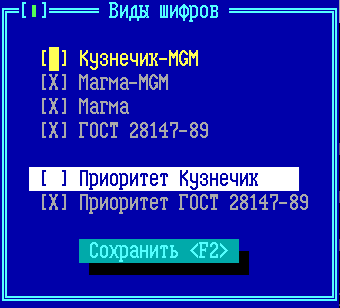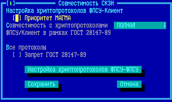 Настройка криптопротоколов ФПСУ-Клиент – опции, устанавливающие работу ФПСУ с ФПСУ-IP/Клиентами в режиме шифрования по заданному алгоритму: •Приоритет Магма – при установлении флага передаваемые данные между ФПСУ и ФПСУ-IP/Клиентом будут шифроваться по алгоритму «Магма», если и ФПСУ, и ФПСУ-IP/Клиент поддерживают этот алгоритм. •Совместимость с криптопротоколами ФПСУ/Клиент в рамках ГОСТ-89 – По умолчанию установлено значение «Отключена». Возможные параметры: КРОМЕ Тун 1 – создаются защищенные соединения с ФПСУ-IP/Клиентами, использующих СКЗИ, отличное от «Туннель/Клиент». КРОМЕ Тун 2 – создаются защищенные соединения с ФПСУ-IP/Клиентами, использующих СКЗИ, отличное от «Туннель 2.0». Полная – принимаются пользовательские подключения от ФПСУ-IP/Клиентов с любой версией СКЗИ. Отключена – принимаются пользовательские подключения только от ФПСУ-IP/Клиентов, начиная с версии ПО 6.0.38 (и устройства VPN-Key с версией микрокода 7-й или выше, поддерживающей алгоритм МАГМА). •Запрет ГОСТ-89 – при установлении флага на ФПСУ будут запрещены любые соединения, использующие алгоритм шифрования ГОСТ 28147-89. Настройка криптопротоколов ФПСУ-ФПСУ – опции, устанавливающие работу ФПСУ с ФПСУ в режиме шифрования по заданному алгоритму, в отдельном окне «Виды шифров»: