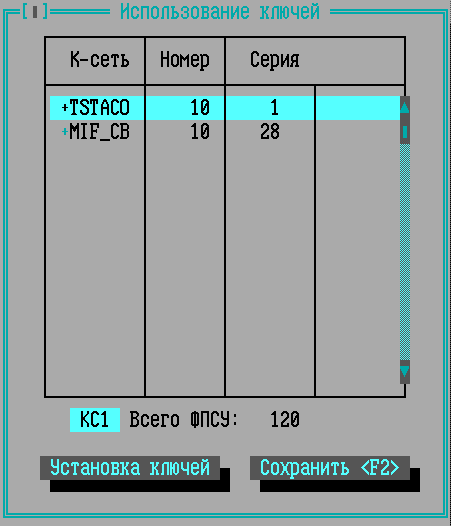 Прежде чем установленные криптографические ключи могут быть использованы в конфигурации ФПСУ, их требуется отметить, как разрешенные к применению. Разрешенные к использованию в конфигурации ФПСУ ключи отмечены символом <+> в строке рядом с именем криптосети.