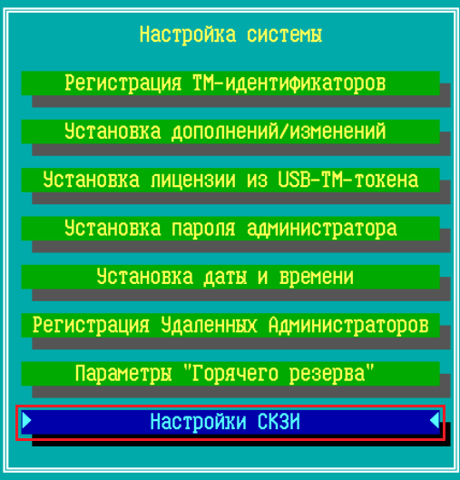При выполнении команды «Настройки СКЗИ» происходит переход в меню «Настройки СКЗИ», содержащее следующие пункты: