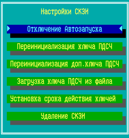 Команда «Настройки СКЗИ» меню «Настройка системы» предназначена для перехода в интерфейс отключения подсистемы автозапуска, повторной инициализации программного датчика случайных чисел, управления сроками действия ключевых данных ФПСУ, удаления СКЗИ с внутреннего носителя ФПСУ.
