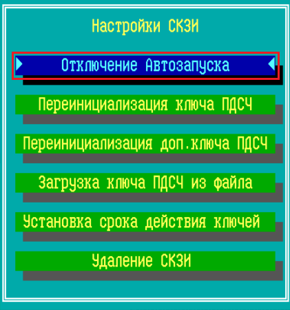 Команда «Отключение Автозапуска» предназначена для отключения подсистемы автозапуска, если она была ранее задействована локальным администратором. Команда «Отключение Автозапуска» выполняется из пункта «Настройки СКЗИ».