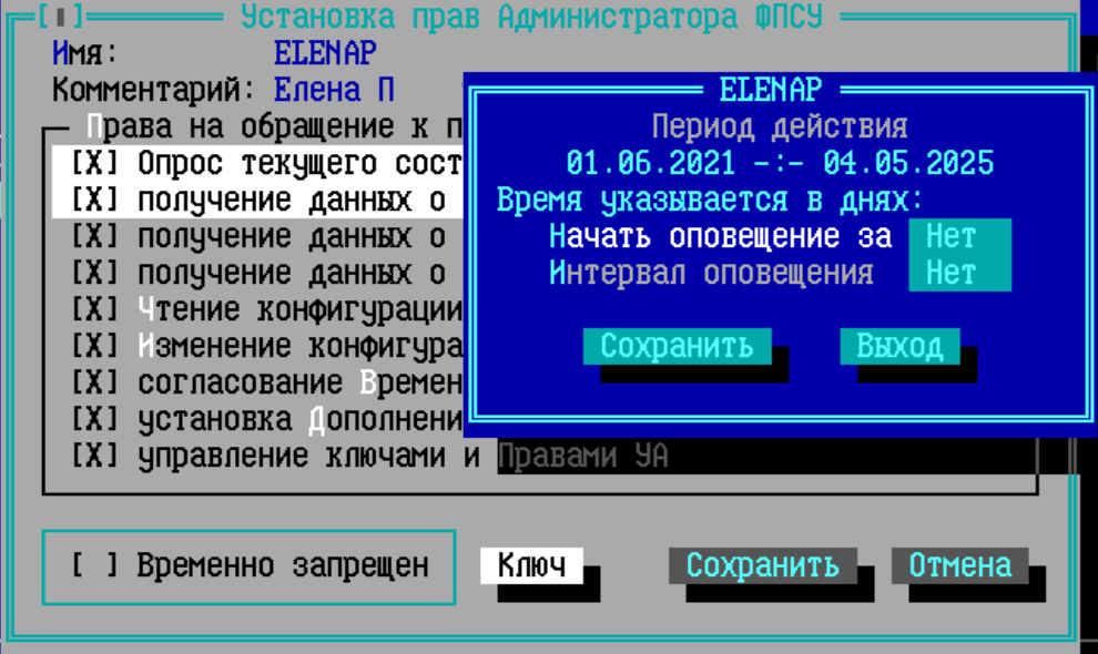 Для присвоения удаленному администратору прав на доступ к подсистемам ФПСУ или изменения существующих, необходимо отметить его в списке и нажать <Enter>. В появившемся окне можно установить или изменить права (права на опрос текущего состояния и получения протокола работы абонентов всегда включены) и разрешить/временно запретить работу удаленного администратора.