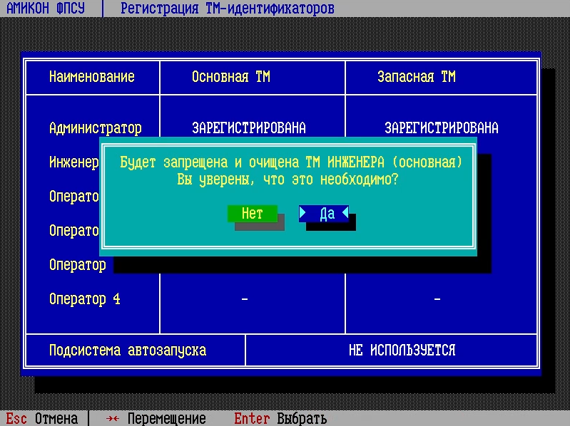 Затем необходимо убрать ТМ-идентификатор администратора и предъявить ТМ-идентификатор инженера для его удаления. При этом соответствующий ТМ-идентификатору ключ запуска будет удален с ФПСУ.