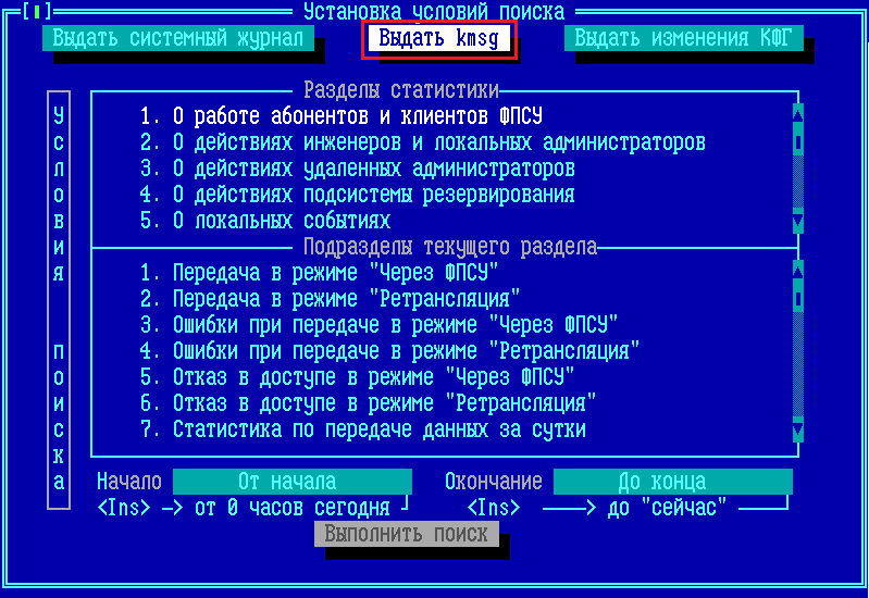Команда «Выдать kmsg» окна просмотра статистики ФПСУ («Статистика ФПСУ») позволяет выдать на внешний носитель (USB-flash) файл для анализа сообщений ядра и использования памяти в случае падения ядра Linux.