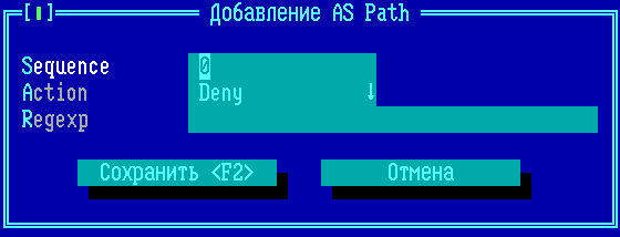 Sequence – порядковый номер правила в списке AS-Path, определяет порядок сканирования правил при проверке соответствия маршрута условиям списка AS-Path. Action – разрешающее или запрещающее действие правила, удовлетворяющего условиям regexp. Regexp – регулярное выражение, которому должен соответствовать AS-Path. AS-Path представляет собой список чисел - номеров автономных систем. Регулярное выражение строится по правилам регулярных выражений Unix, но пробелу соответствует символ подчеркивания «_». Для дальнейшей настройки протокола BGP необходимо перейти на следующую вкладку. Для выхода в меню с сохранением настроек протокола BGP, нажмите кнопку «Сохранить» или клавишу <F2>. Для выхода без сохранения настроек нажмите клавишу <Esc>. |