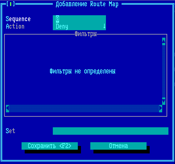 •Deny – если маршрут совпадает с условием фильтра, обработка карты маршрута завершается отклонением маршрута.