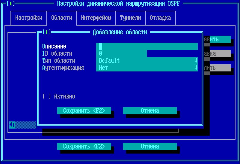 Для выхода в меню с сохранением настроек протокола OSPF, нажмите кнопку «Сохранить» или клавишу <F2>. Для выхода без сохранения настроек нажмите клавишу <Esc>.