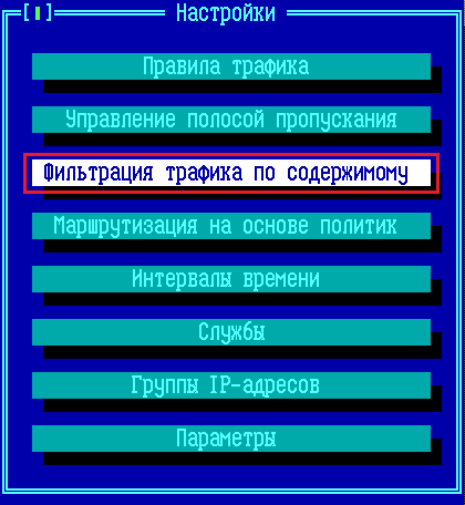 В дополнение к фильтрации по правилам маршрутизации и правилам трафика межсетевого экрана, на ФПСУ реализована фильтрация и принятие решения о блокировке пакета на основе передаваемого содержимого. Анализируются передаваемые данные различных протоколов, в том числе методы, контент и адрес http-запросов. ВНИМАНИЕ! В случае использования версии ФПСУ для виртуальной среды, виртуальной машине необходимо выделить минимум 2 гигабайта оперативной памяти для работы модуля фильтрации трафика по содержимому! Переход в окно списка правил фильтрации трафика по содержимому передаваемых пакетов осуществляется выбором команды «Фильтрация трафика по содержимому» подменю «Настройки»: