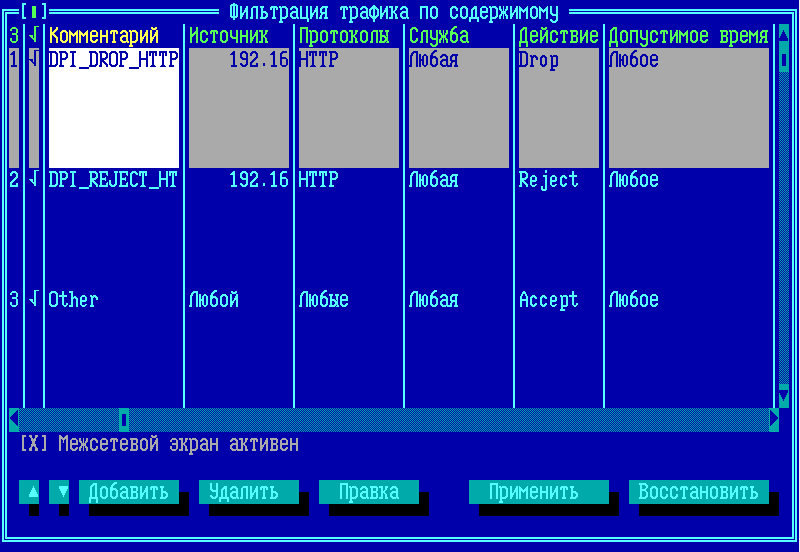 Фильтрация трафика по содержимому осуществляется только при активном межсетевом экране ФПСУ. Флаг «Межсетевой экран активен» указывает на работу дополнительных правил фильтрации, в том числе правил фильтрации трафика по содержимому. Для внесения изменений в конфигурацию без выхода из окна, нажмите кнопку «Применить». Сохранение изменений с выходом в подменю «Настройки» осуществляется по нажатию клавиши <F2>. Выход с отменой внесенных изменений осуществляется по нажатию клавиши <Esс>, кнопка «Восстановить» отменяет внесенные за последний сеанс администрирования изменения без выхода из окна «Правила трафика». См. далее: Создание правила фильтрации по содержимому и его общие настройки Исследуемый правилом фильтрации трафика по содержимому протокол |