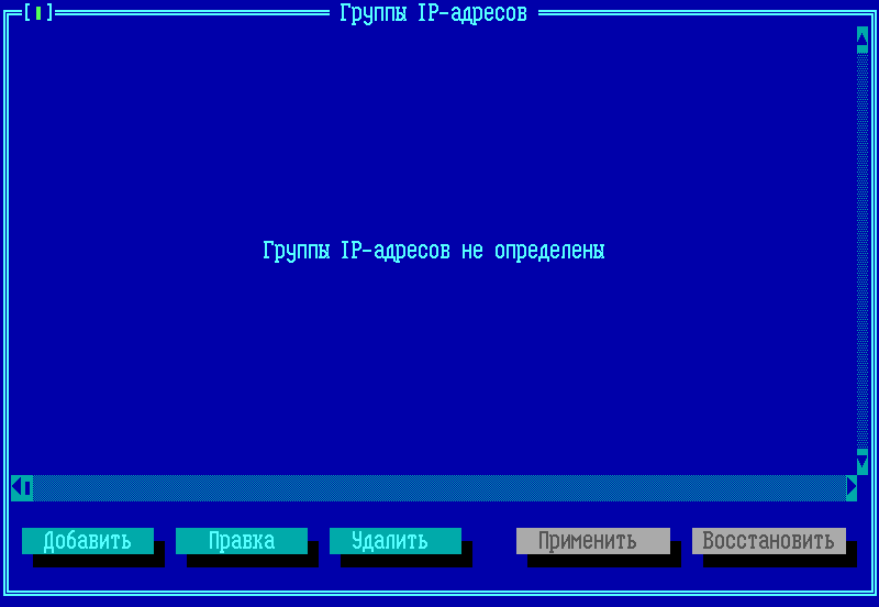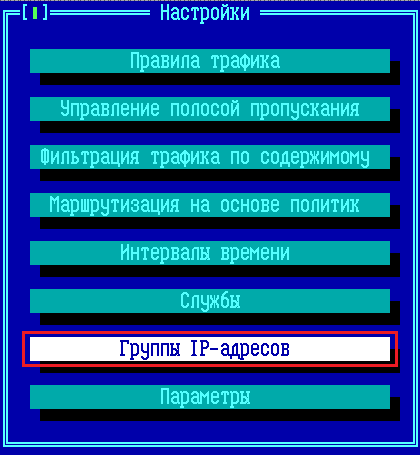 Действие создаваемого правила трафика (пункт «Правила трафика») можно ограничить, установив его действие не на все передаваемые данные между указанными отправителями и получателями, а только на те, которые дополнительно входят и в диапазон указанных во вкладке «Группы IP-адресов». В окне, вызываемом по выполнению команды «Группы IP-адресов» меню настройки конфигурации «Параметры доступа» правил дополнительной фильтрации, находится список созданных администраторами ФПСУ групп IP-адресов (по умолчанию пустой).
