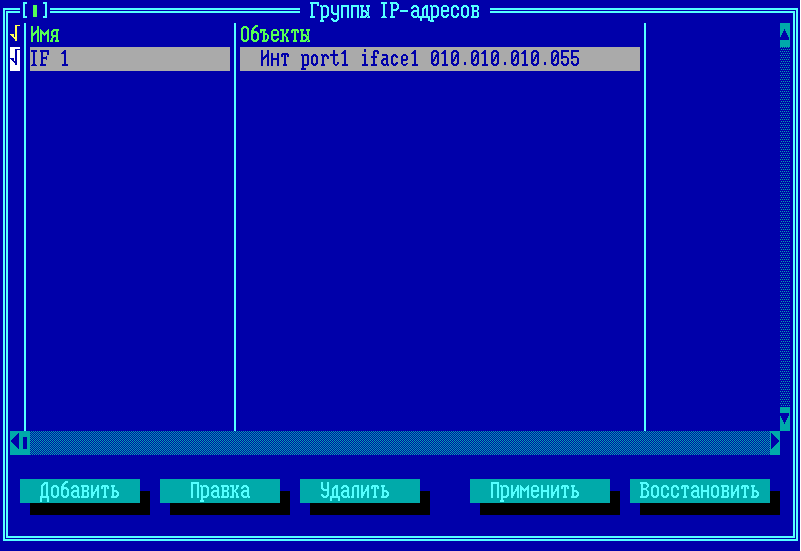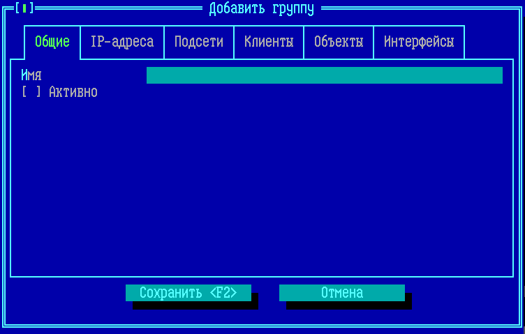 Вкладка Общие содержит символьное название создаваемой группы, которое будет использоваться для привязки группы IP-адресов к тому или иному правилу трафика, и флаг «Активно», подтверждающий действие внесенных в группу изменений. Вкладка IP-адреса содержит список входящих в группу отдельных IP-адресов (по умолчанию пустой). IP-адреса, вносимые в список, должны принадлежать диапазону описанных и разрешенных к маршрутизации IP-адресов (см. раздел «Порты ФПСУ»). Вкладка Подсети содержит список входящих в группу подсетей, выбранных из маршрутизации (по умолчанию пустой). Подсети IP-адресов, вносимые в список, должны принадлежать диапазону описанных и разрешенных к маршрутизации IP-адресов (см. раздел «Порты ФПСУ»). Вкладка Клиенты содержит список (по умолчанию пустой) входящих в группу описателей ФПСУ-IP/Клиентов, выбранных из списка зарегистрированных на данном ФПСУ криптосетей и групп клиентов (см. раздел «Клиент для ФПСУ»). Вкладка Объекты содержит список входящих в создаваемую группу других групп IP адресов (по умолчанию пустой). Вкладка Интерфейсы содержит список входящих в создаваемую группу интерфейсов ФПСУ (по умолчанию пустой). После сохранения группы, она помещается в окно списка:
