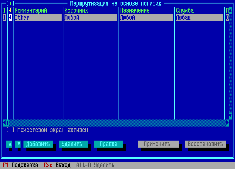 В открывшемся окне будет выведен список используемых на ФПСУ правил фильтрации трафика на основе политик. Правило по умолчанию одно — Other — носит разрешительный характер, самый низкий приоритет, и не устанавливает никаких дополнительных ограничений к проходящим через ФПСУ пакетам.
