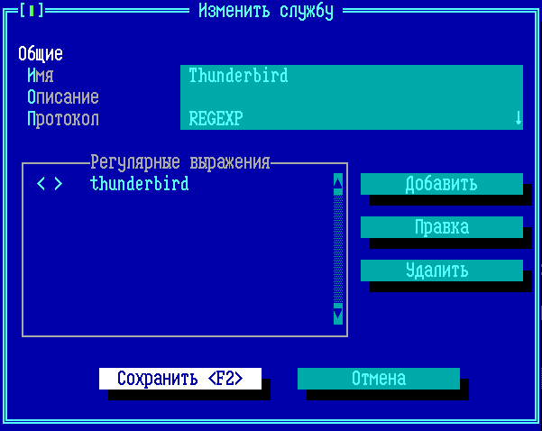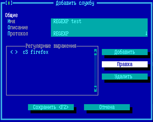 Поле ввода окна «Добавить» - символьная строка или регулярное выражение, не должно быть пустым, количество символов ограничено 1024, обязательная опция. Межсетевой экран исследует передаваемые пакеты на наличие в IP-пакете символьной строки/регулярного выражения, указанных в поле ввода. Символьная строка ищется в кодировке cp866, если требуется искать символьную строку в другой кодировке, то следует использовать запись в кодах Unicode через символ «\u» с включенной опцией Регулярное выражение. Например, для поиска сочетания латинской буквы А с латинской буквой B (символьной строки AB) следует написать в поле значение «\u0041\u0042». Пакеты от клиента - опция, указывает на то, что символьную строку/регулярное выражение следует искать только в пакетах, передающихся от инициатора соединения (клиента) к принимающей соединение стороне (серверу). Пакеты от сервера - опция, указывает на то, что символьную строку/регулярное выражение следует искать только в пакетах, передающихся от принимающей соединение стороны (сервера) к инициатору соединения (клиенту). ВНИМАНИЕ! Должна быть задействована хотя бы одна из опций «Пакеты от клиента» или «Пакеты от сервера» (могут быть задействованы обе)! Строка с учетом регистра - необязательная опция. Указывает на то, что в анализируемой символьной строке важен регистр (прописные или ЗАГЛАВНЫЕ символы). Регулярное выражение - необязательная опция. Указывает на то, что в поле ввода указана не символьная строка, а регулярное выражение. Используются регулярные выражения библиотеки glibc (подробнее можно посмотреть в официальной документации на регулярные выражения glibc, https://www.gnu.org/software/libc/manual/html_node/Regular-Expressions.html). Включение опции «Регулярное выражение» отключает опцию «Строка с учетом регистра». Для сохранения настроек окна «Добавить» и возврата в окно «Добавить службу», нажмите кнопку «Сохранить (F2») или клавишу <F2>. Для выхода из окна «Добавить» без сохранения изменений используйте кнопку «Отмена» или клавишу <Esc>. После сохранения новая запись появится в списке «Регулярные выражения» окна «Добавить службу».