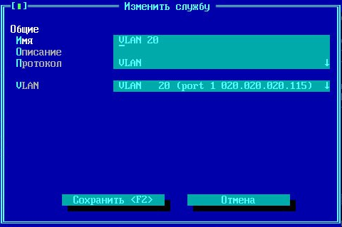 При выборе в добавлении/изменении службы типа протокола VLAN отображается поле для выбора идентификатора описываемого VLAN, выбираемый идентификатор VLAN предварительно должен быть задан в настройках одного из портов.