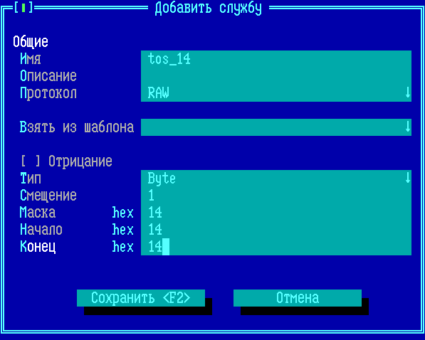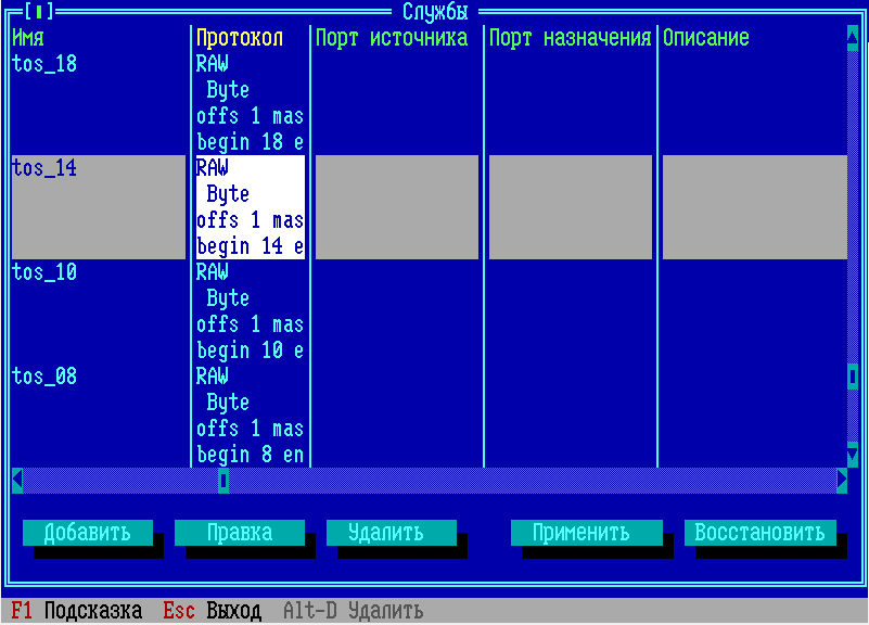 В IP-заголовке имеются редко используемые биты – TOS (Type of Service – Тип обслуживания). Эти биты задают способ обслуживания пакета: «Minimum Delay» (минимальная задержка), «Maximum Throughput» (максимальная пропускная способность), «Maximum Reliability» (максимальная надежность) и «Minimum Cost» (минимальная стоимость канала). Одновременно может быть установлен только один из этих битов. Как правило, флаг «Minimum Delay» устанавливается в пакетах для telnet и ftp-control, а в пакетах ftp-data – «Maximum Throughput». На ФПСУ необходимо настроить соответствующий способ обслуживания. Также следует разрешить главные типы ICMP протокола (0, 3, 4, 11, 12). Типы ICMP-сообщений: 0 – echo reply (echo-ответ, пинг); 3 – destination unreachable (адресат недосягаем); 4 – source quench (подавление источника, просьба посылать пакеты медленнее); 11 – time-to-live exceeded (истечение срока жизни пакета); 12 – IP header bad (неправильный заголовок IP-пакета). Пропускная способность скрытого канала: 1 байт на IP-датаграмму при использовании всего поля ToS; 1 бит на IP-датаграмму, если используется только бит задержки. Для включения запрещающего правила в ФПСУ необходимо: Добавить несколько следующих служб протокола RAW (см. раздел «Службы») и включить их в правило трафика с запрещающим основным действием (Drop или Reject):