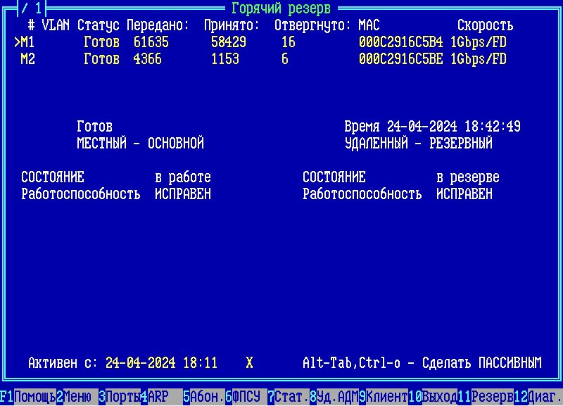 Вызов окна отображения состояния текущей работы ФПСУ с партнером по резервированию осуществляется по нажатию клавиши <F11>. Если подсистема горячего резервирования не была задействована, то на этом экране находится только текст «подсистема горячего резервирования не сконфигурирована». Дальнейший текст в пункте предполагает, что подсистема горячего резервирования ФПСУ была сконфигурирована и задействована (см. пункт «Параметры «Горячего резерва»»). В окне отображается статистическая информация о количестве и состоянии VPN-туннелей (защищенных каналов связи между наблюдаемым ФПСУ и его партнером по резервированию), через которые происходит взаимодействие между участвующими в системе «горячего» резервирования ФПСУ. Для ФПСУ, начиная с релиза программного обеспечения 2.65, может быть установлено до четырех таких туннелей, до двух через сетевые адаптеры подсистемы горячего резервирования, и до двух через сетевые адаптеры рабочих портов. На экране порты 1 и 2 - это 3 и 4 LAN-адаптеры в настройках конфигурации для горячего резерва (см. пункт «Конфигурация драйверов сетевых адаптеров» окно «Конфигурация LAN-адаптеров»). Флаг «М» слева от номера порта означает, что для шифрования данных в VPN-туннеле используется блочный шифр «Магма». Флагом «*» отмечены туннели, организованные через сетевые адаптеры, которые были специально выделены в конфигурации LAN-адаптеров ФПСУ для работы только с подсистемой «горячего» резервирования (см. пункт «Конфигурация драйверов сетевых адаптеров»). Не отмеченный символом «*» туннель организован через сетевой адаптер, который в конфигурации ФПСУ настроен в качестве рабочего порта.